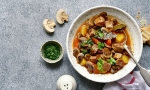 600 g telečjega mesa 200 g gobic, narezanih na kolobarje (šampinjoni ali katere druge gobe) 2 žlici oljčnega olja 1 čebula, sesekljana 2 korenčka, narezana na kolobarje 2 krompirja, narezana na kocke 2 stroka česna, nasekljana 2-3 lovorovi listi 1 žlička timijana – lahko uporabimo suhega ali svežega sol poper 1 l vroče goveje jušne osnove 2 dl paradižnikove omake 1 žlica svežega peteršilja za okras