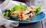 Pečico segrejemo na 200 stopinj. V pekač, namaščen z oljem, v plasteh naložimo jajčevce, bučke, mocarelo, paradižnik in testenine ter začinimo s soljo in poprom. Zaključimo s plastjo lazanje. Prelijemo z bešamel omako in pazimo, da so testenine prekrite. Potresemo z nastrganim parmezanom in 40 minut pečemo v pečici. Takoj ponudimo.