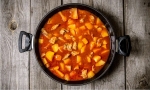 1/2 kg govedine, svinjine, tudi piščanca brez maščobe 1,5 kg krompirja 20 strokov česna 5 zrelih paradižnikov 2 žlici mlečnih koruznih zrn oljčno olje, lovor ali kumina košček čilija majaron, bazilika kanček vinskega kisa