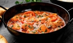 Zalijemo z vodo in zavremo. Papriki očistimo in narežemo na kolute, paradižnik za 20 sekund potopimo v vrelo vodo, ga olupimo in narežemo na koščke.