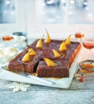 Medtem znova zavremo tekočino, v kateri so se kuhale hruške, in jo na nizki temperaturi kuhamo, dokler ne nastane svetleč sirup. Pečen kolač naj se ohlaja 5 do 10 minut, nato ga po vsej površini premažemo s sirupom. Preostalega postrežemo ob kolaču, zraven pa po želji še veganski sladoled.