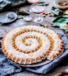 Preostalo testo spet tanko razvaljamo (kot za rezance) in ga z rezalnim koleščkom razrežemo na trakove, široke 2 cm. Okrasne trakove s prsti valovito nabiramo in pritiskamo oziroma lepimo na rob testa. Začnemo na sredini polža. Torto na začetku in koncu okrasimo s celimi mandlji, nato jo damo v pečico in pečemo približno 40 minut.