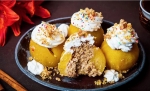 Poberemo jih previdno ven in pustimo, da se odcedijo in ohladijo. Ohlajena jabolka napolnimo z nadevom iz sladkorja, mletih orehov in mandljev, nastrgane limonine lupine in stepene kisle smetane.