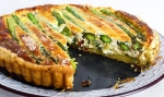 V posodi razžvrkljamo jajca in sladko smetano, vmešamo nariban parmezan, edamec, skuto, sol, poper in malo muškatnega oreščka. Dodamo še mešanico špargljev, šalotke in pancete, rahlo zmešamo in vse skupaj enakomerno porazdelimo po pečenem testu. Po vrhu okrasimo s celimi šparglji. Pečemo približno 25 minut, da se lepo zlato-rjavo zapeče.