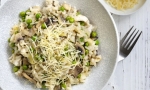 Premešamo in takoj, ko se tekočina vpije, zalijemo z drugo zajemalko juhe in rižoti dodamo še grah.