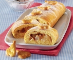 Zvijemo testo v rulado, ga položimo v pekač in ga premažemo z jajcem. Pečemo v predhodno ogreti pečici na 180°C 30 minut. Na enak način pripravimo tudi druga dva zvitka. Ko se ohladijo, jih narežemo na kose in posujemo s sladkorjem v prahu.