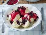 Za preliv: mleko zavrete z maslom, sladkorjem in koruznim škrobom. Dodajte oprane borovnice, zavrite za kratek čas, dodajte smetano. Pustite, da zavre in odstavite. Cmoke postrezite s toplo omako.