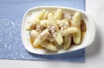 Nato precedite, da se krompirjevi svaljki odtečejo. Prestavite v skledo in zmešate s stopljenim maslom. Postrezite jih s praženimi ovsenimi kosmiči, medom, pomešanim z melaso in sladkorjem v prahu.