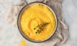 Na koncu vmešajte maslo, da polenta postane še bolj kremasta, in po želji dodajte nariban sir. Dobro premešajte.