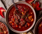 V srednje veliki skledi zmešajte papriko, 2 žlički soli in poper. Goveje kocke obložite z mešanico začimb in jih pecite v loncu, kjer ste prepražili čebulo, dokler ne porjavijo z vseh strani.