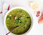 Tekočino zavrite, znižajte temperaturo na najnižjo možno raven in pokrito kuhajte, dokler se krompir ne zmehča, 10 do 15 minut. Nato v juho dodajte grah in zelenje ter mešajte, dokler zelenje ne zvodeni.