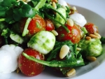 200 g češnjevih paradižnikov, 150 g mini mozzarelle, 2 pesti sveže rukole, 30 g pinjol, 2 žlici pesta (pripravljen doma ali kupljen), 1 žlica oljčnega olja. sol in poper po okusu.