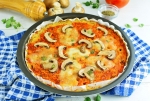 Nato vzamemo testo iz pečice in ga nadevamo s poljubnim nadevom. V tem primeru pico namažemo s humusom, dodamo gobe nameko, špinačo in kuhano koruzo. Lahko dodamo tudi čebulo, artičoke in olive in pečemo še 5–10 minut.