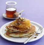 Palačinke razdelimo na dva krožnika, jih obložimo s pomarančnimi rezinami, prelijemo z medom, posujemo z grobo sesekljani pistacijami in še tople postrežemo.