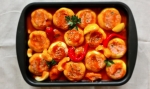 Polijemo jih po paprikah, ko so te že oddelale svojo uro pečenja. Pekač vrnemo v pečico, kjer bo po približno 20 minutah zavrela. Takrat je tudi pečenja konec.