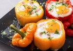 Vmes slanino ali šunko narežemo na kose, sir pa grobo naribamo. Pekač odstranimo iz pečice in počakamo, da se paprike malce ohladijo, nato pa v vsako dodamo žlico naribanega sira in nekaj kosov šunke ali slanine. Na vrh previdno ubijemo jajce, ki ga rahlo posolimo in popopramo. Vse skupaj pečemo v ogreti pečici še 10 do 15 minut. Če želimo, da bo rumenjak v sredini še tekoč, papriko iz pečice odstranimo po približno 10 minutah peke, drugače pa vse skupaj pečemo še nekaj minut oziroma toliko časa, da je jajce pečeno po našem okusu.