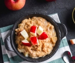 100 g ovsenih kosmičev 400 ml nesladkanega mandljevega mleka 2 srednje veliki jabolki, narezani na kocke 1 čajna žlička kokosovega olja 1 čajna žlička mletega cimeta 1⁄4 čajne žličke mletega muškatnega oreščka 2 žlici javorjega sirupa žlička limoninega soka