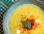 4 srednje rumene paprike, očiščene in grobo sesekljane 1 srednje velik krompir, olupljen in narezan na majhne koščke 1 srednje velika rumena čebula, drobno sesekljana 2 stroka česna, drobno sesekljana 1–2 stebli mlade čebule, drobno sesekljani 1 lovorjev list ¼ čajne žličke mletega črnega popra Sol po okusu 4,5 skodelice zelenjavne osnove 1 žlica olivnega olja
