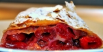 Pekač namažemo z maslom. Spočito testo pomokamo in razvaljamo na približno polmetrski krog ter ga namažemo z oljem. Preložimo ga na pomokan prt in s pomočjo hrbtne strani dlani čim tanjše razvlečemo. V ponvi na maslu na hitro prepražimo orehe. Pečico segrejemo na 180° C, medtem pa razvlečeno testo potresemo s praženimi orehi. Nato do slabe polovice testa razdelimo češnje z rabarbaro in jih potresemo s sladkorjem ter mešanico lupine limone in klinčkov. Vse skupaj pokapljamo še z mešanico smetane in jajca ter s pomočjo prta začnemo zavijati na nadevani strani. Zavitek položimo v pekač, premažemo s stopljenim maslom in damo za slabe pol ure v segreto pečico.