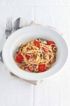 Odcedimo testenine in jih vrnemo v lonec ter dodamo vsebino ponve. Previdno premešamo, dodamo polovico limonovega soka, pretresemo in po potrebi dosolimo ter začinimo, pokrijemo in pustimo na toplem. Nazadnje na hitro pripravimo sardone. Prej uporabljeno ponev obrišemo s papirnato servieto ter vanjo vlijemo preostalo žlico olja in pristavimo. Očiščene ribe natremo s soljo in položimo v vročo ponev ter pečemo nekaj minut po vsaki strani. Testenine razdelimo na štiri segrete krožnike, na vsakega položimo po dva sardona, poškropimo z limonovim sokom in potresemo s preostalim koromačevim zelenjem.