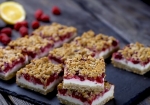Prihranjeno skodelico mešanice drobtin potresite po malinah.