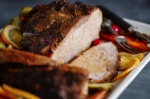 Pečico segrejte na 200 °C. Svinjsko pečenko položite na sredino pekača, zelenjavo razporedite okoli mesa. Pečemo 45–60 minut, odvisno od debeline mesa, in občasno prelijte z lastnim sokom. Zadnjih 10 minut lahko uporabite funkcijo žara, da dobite hrustljavo skorjico.