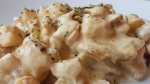200 ml sladke smetane, 100 ml mleka, 100 g parmezana (ali drugega trdega sira, npr. grana padano), 2 stroka česna, 1 majhna čebula, 50 g masla, svež peteršilj (za posip), sol in sveže mlet poper po okusu, ščep muškatnega oreščka (po želji).
