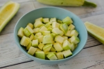 Če vam ni uspelo nabrati mladih bučk, iz sredine ploda odstranite jedro s semeni. Pri mladih bučkah lupine ni treba odstraniti, pri prezrelih pa jo je bolje odrezati. Bučke narežite po želji. To so lahko kolobarji, vzdolžne rezine ali kocke.