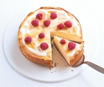 250 g maskarponeja 600 g kremnega sira 2 jajci 2 rumenjaka lupinica 3 limon 4 žlice moke 175 g sladkorja premaz in okras 1,5 dl kisle smetane 3 žlice limonove kreme ali marmelade pest malin (po želji)