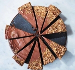 Torto vzamemo iz zamrzovalnika 30 minut pred postrežbo oziroma počakamo toliko časa, da jo lahko narežemo z ostrim nožem. Ob robu jo posujemo z lešniki, narežemo in ponudimo.