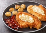 Meso damo v stekleno posodo, dodamo pinjenec in pokrito damo v hladilnik ter mariniramo vsaj eno uro. Potem zrezke obrišemo do suhega in jih natremo s soljo in malo popra. Pečico segrejemo na 180 stopinj. Meso povaljamo v moki, stepenih jajcih in nazadnje v drobtinah ter položimo v pekač, namaščen z maslom. Del masla raztopimo in pokapljamo panirano meso. Pečemo v pečici 30 do 40 minut.