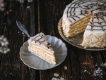 Ko je glazura strjena, odstranimo tortni obroč. Torto po obodu premažemo s prihranjeno kremo in za konec obložimo z mandlji v lističih. Te lahko po peki beljakovih biskvitov popražimo na pekaču 3 minute na 200 stopinjah.