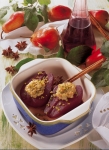 Preden hruške postrežemo, stepemo sladko smetano z vaniljevim sladkorjem in napolnimo izdolbene hruške, okrasimo z višnjami.