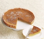 750 g bučnega mesa (npr. lunga di Napoli) 350 g krhkega testa 140 g sladkorja ½ žličke soli ½ žličke muškatnega oreška 1 žlička cimeta 2 razžvrkljani jajci 25 g stopljenega masla 1,7 dl mleka moka za delovno površino fižol za slepo peko 1 žlica sladkorja v prahu za posip