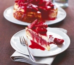 Medtem pripravimo omako tako, da sladkor zmešamo z 1 dl vode in nežno segrevamo, da se raztopi. Dodamo očiščene in na večje rezine narezane jagode in kuhamo 3 minute, da se tekočina obarva rožnato in se jagode rahlo zmehčajo. Polovico jagod s penovko poberemo iz tekočine, preostalo polovico pa ohladimo v tekočini. Ohlajene nato pretlačimo skozi cedilo in tako dobljeno omako premešamo s celimi jagodami. Torto prelijemo z jagodno omako, po želji dodamo še žlico kisle smetane in postrežemo.