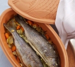 Lonec pokrijemo s pokrovom in vse skupaj pečemo v prej ogreti pečici, najprej 25 minut pri 120 °C, potem pa nadaljnjih 25 minut pri 180 °C. Postrvi serviramo z zelenjavo na krožnike in takoj ponudimo.