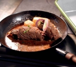 4 rezine rostbifa po 120 g 1 drobno narezana čebula 2 žlici gorčice omaka sol poper 1 žlica vloženih poprovih zrn 1,25 dl rdečega vina 2,5 dl soka od pečenke 2 žlici sladke smetane nadev 2 žlici oljčnega olja 100 g kuhanih širokih rezancev 3 na kockice narezane kisle kumarice 50 g posušenih paradižnikov 1 žlica nasekljanih rožmarinovih lističev 2 rumenjaka 2 žlici naribane mocarele zelenjavna priloga 1 žlica masla 200 g korenčka, narezanega na palčke (ali prgišče blanširanih grahovih strokov) 1 porovo steblo