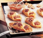 Na sredino kvadratov porazdelimo orehov nadev. Po dva nasprotna vogala preganemo enega čez drugega in testo premažemo s stepenim jajcem. Na vrh vsake ladjice položimo polovičko orehovega jedrca.