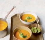 Prilijemo jušno osnovo, zavremo in nežno kuhamo 40 minut, da je korenček zelo mehak. Pustimo, da se malo ohladi, nato juho gladko zmešamo s paličnim mešalnikom ali v multipraktiku. Dodamo limonov sok ter solimo in popramo po okusu. Juho zlijemo nazaj v lonec, dodamo mleko in pogrejemo. Ponudimo jo s salso iz indijskih oreškov in koriandra ter z mlado čebulico, narezano na kolobarčke.