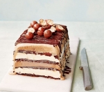 V nepregorni skledici nad nežno vrelo vodo stopimo preostalih 50 g čokolade. Terino dvignemo iz modela in jo zvrnemo na pladenj. Pokapamo jo s stopljeno čokolado in obložimo z zdrobljenimi hrustljavimi kroglicami. Narežemo jo na debele rezine in postrežemo.
