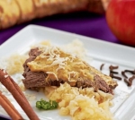 Kuhano govedino narežemo na rezine, v juhi segrejemo, nato pa dobro odcedimo in rezine tanko namažemo z začimbno gorčico. Rezine govejega mesa serviramo na krožnike s pripravljenim jabolčnim hrenom; potresemo s kolobarčki drobnjaka in ponudimo.