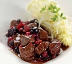 Meso narežemo na 2 centimetra velike kocke. V kozici segrejemo kuhano maslo in mesne kocke na njem lepo popečemo. Začinimo s soljo in poprom ter pokrito dušimo, dokler mesni sok ne izpari. Sadne jagode preberemo in jih skupaj z rjavim sladkorjem dodamo k mesu. Zalijemo z rdečim vinom, dodamo brinove jagode in pokrito kuhljamo približno 1 uro. Omako povežemo s hladnim maslom in po okusu začinimo. Priprava pireja: