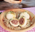 Zdaj pripravimo nadev. Govedino in prekajeno meso zmeljemo z mesoreznico ter začinimo s soljo, poprom in zelišči. Na maščobi rahlo prepražimo drobno narezano čebulo in nasekljan česen; dodamo k mesni masi in dobro premešamo. Iz nadeva naredimo 12 primerno velikih kroglic in jih damo za pol ure na hladno.