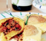 Zdaj pripravimo še nadev. Mesnato slanino in prekajeno trebuševino narežemo na drobne kocke. Dodamo narezan drobnjak, sesekljan peteršilj, zmleto papriko, poper in kumino ter dobro zmešamo.
