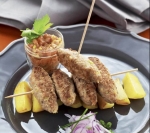 Čevapčiče ponudimo s pečenim krompirjem in pripravljeno zelenjavno salso. Jed okrasimo s čebulnimi kolobarčki.