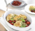 Piščančje prsi s kremnim pestom in pečenim paradižnikom