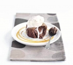 200 g kakovostne temne čokolade, nadrobljene na majhne koščke 200 g masla, narezanega na majhne koščke 200 g svetlo rjavega sladkorja 4 cela jajca 4 rumenjaki 200 g moke 50 g stopljenega masla za modelčke kakav v prahu za modelčke karamelna omaka (glej recept) in vaniljev sladoled ali pomarančni sorbet, ko postrežemo