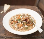 Medtem v primerno veliki ponvi posteklenimo čebulo in česen. Dodamo riž in še tega pražimo kakšno minuto ali dve. Dodamo vino in dušimo, da vino izpari. Nato prilijemo še zajemalko jušne osnove in spet dušimo in mešamo, dokler riž ne posrka vse tekočine. To delamo tako dolgo, da porabimo vso jušno osnovo oziroma da riž postane mehak in kremast. Takrat vmešamo zmečkano bučno meso in po želji začinimo še s soljo in poprom. Jed razdelimo na krožnike, potresemo s prihranjenimi bučnimi kockami in semeni, naribanim sirom in drobnjakom ter postrežemo.