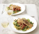 Losos na topli čičerki s pečeno papriko in špinačo