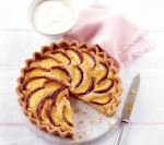 100 g sladkorja 140 g masla 2 jajci 140 g mletih mandljev 50 g moke 3 breskve breskova ali marelična marmelada moka za delovno površino stepena sladka smetana, ko postrežemo